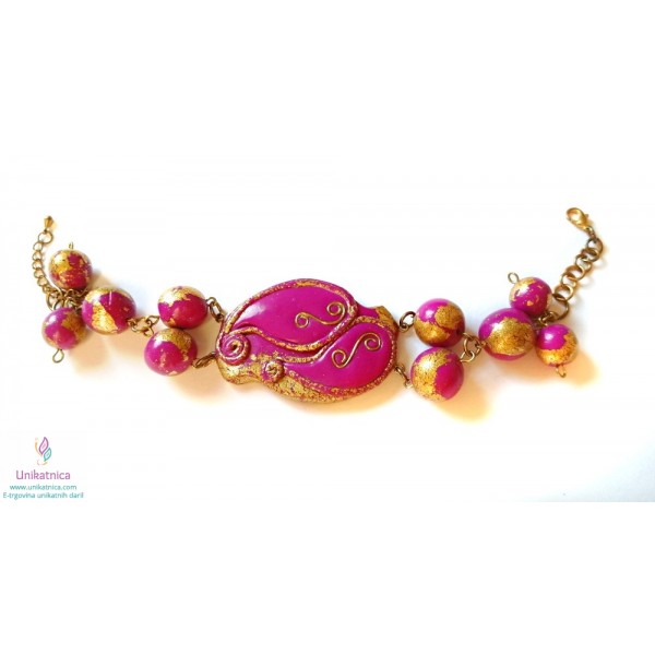 Unikatna, ročno izdelana zapestnica z unikatnim vzorcem iz žice v ciklamni barvi s pozlatitvijo. Vse kroglice so narejene ročno.