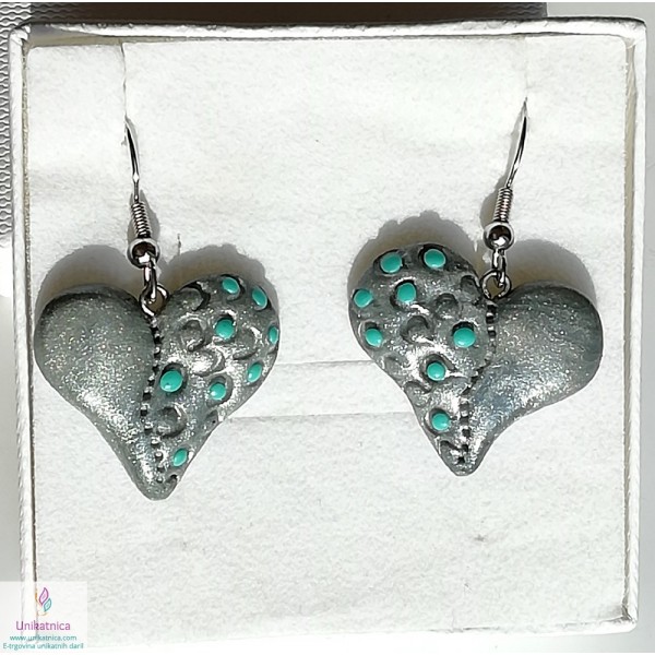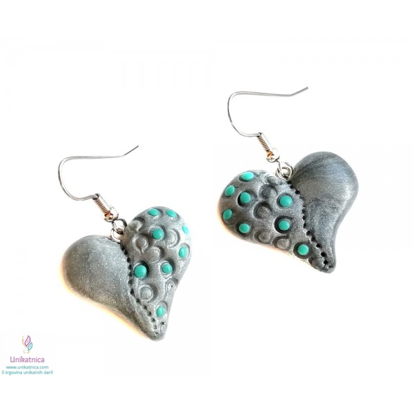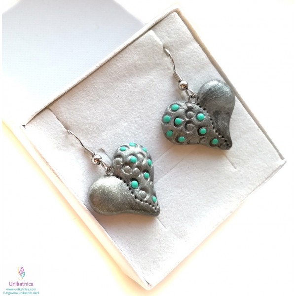 Uhani z motivom srca so ročno izdelan avtorski unikatni izdelek. Uhani so primerni kot lično in vsestransko uporabno darilo za Valentinovo ter druge praznike. Uhani v obliki srca imajo unikaten vzorček v srebrno turkizni barvi in se lepo podajo na elegantnejša oblačila ter tudi oblačila za prosti čas. Uhani so narejeni iz polimerne mase, z dodanimi naravnimi sestavinami. Narejeni so iz koži prijaznih materialov in ne vsebuje niklja, zato so primerni tudi za alergike.