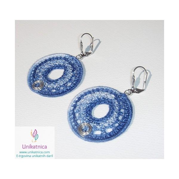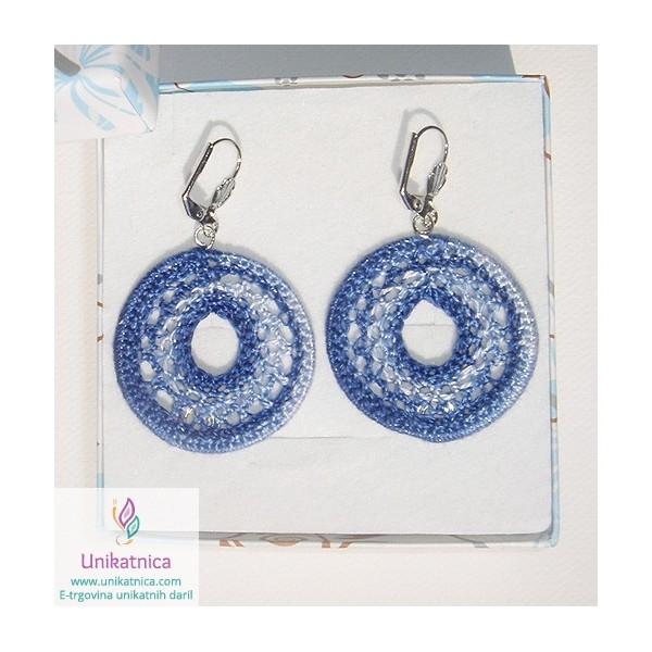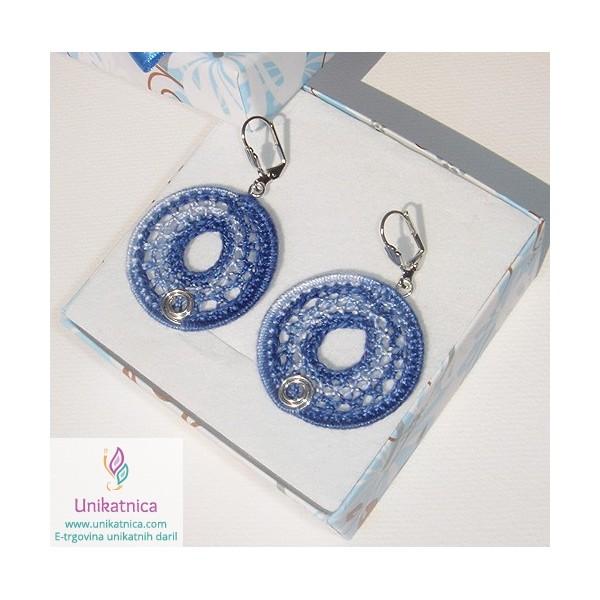 Kvačkani uhani v temno-svetlo modrih odtenkih, so čudovito, izvirno in zelo uporabno darilo oz. unikatni modni dodatek za ženske, ki cenijo izvirna in unikatna darila. Kvačkani uhani se lahko nosijo na obeh straneh.