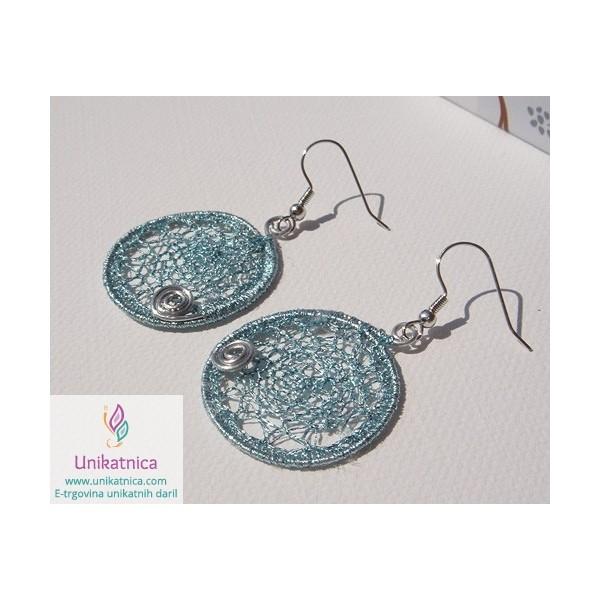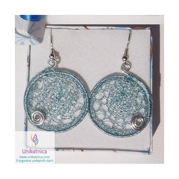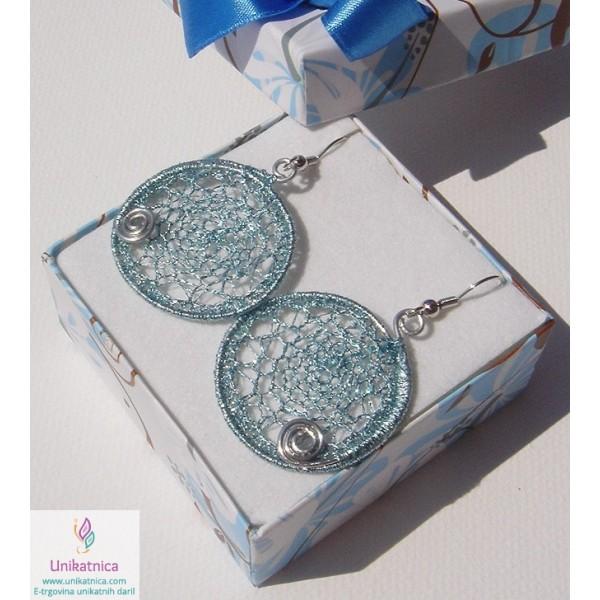 Ročno kvačkani uhani v srebrno modri barvi so ženstven in zelo eleganten nakit, ki se bo čudovito podal na oblačila v številnih modrnih dodatkih. So izjemno lahki za nošenje. Vzorček je na vsaki strani drugačen, zato jih lahko nosite na obeh straneh.